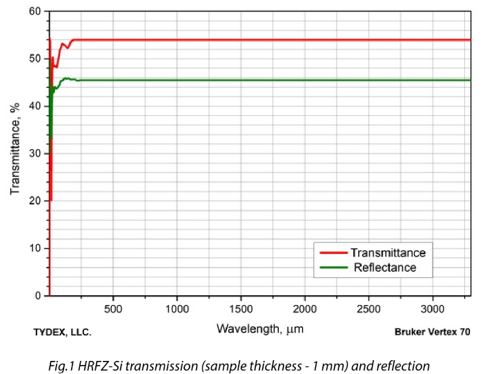 THz分光镜的材质是HRFZ-Si,这些分光镜在没有任何镀膜时可对很广的波长范围内透射/反射比大约为:54/46(%)。