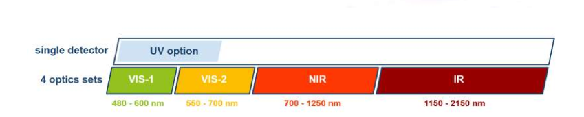 宽广的可用光谱范围,仅需4个晶体即可覆盖480-2150nm(可选),且无需更换探测器